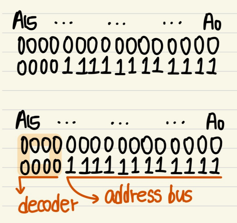 처음 주소와 끝 주소를 비교하였을 때, A15부터 같은 값을 가지는 bit까지를 CS에 연결한다.