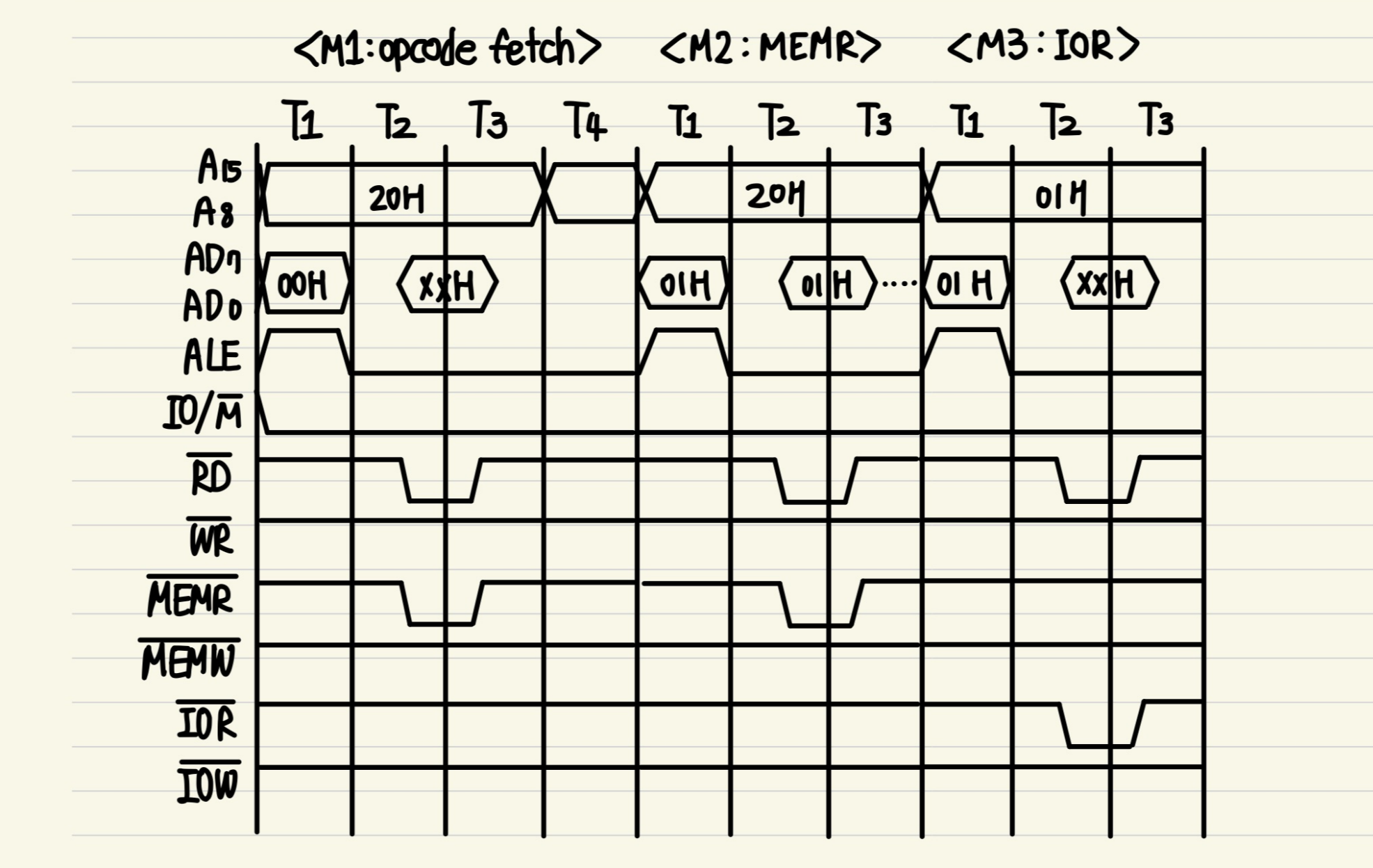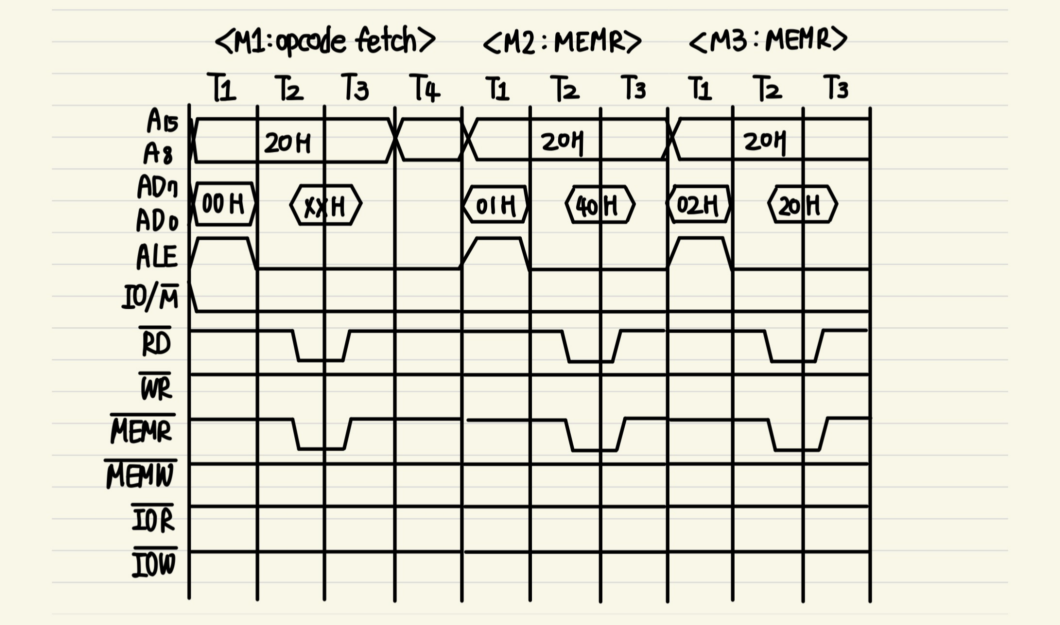 3byte 명령어이지만, opcode fetch + MEMR + MEMR + MEMR cycle을 가진다.