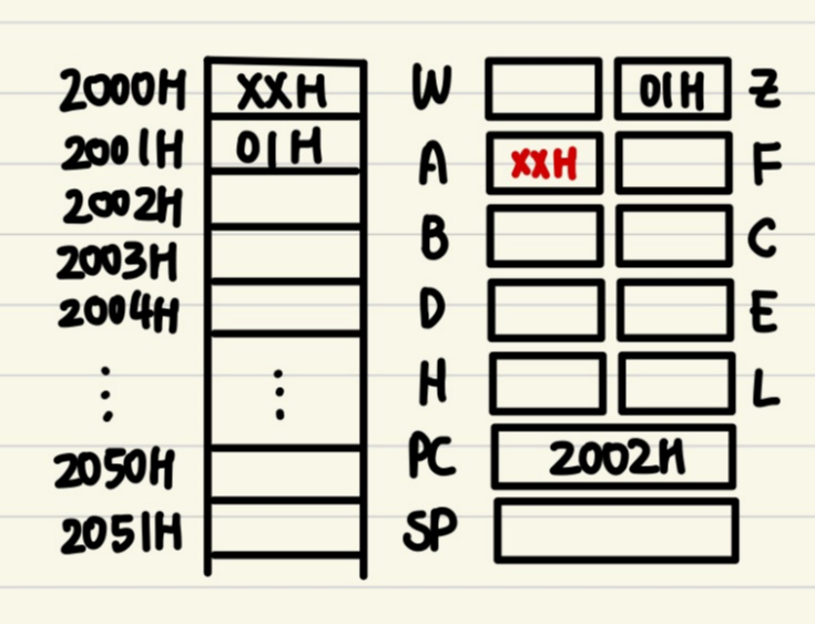 opcode를 실음과 동시에, PC가 2001H로 변한다.