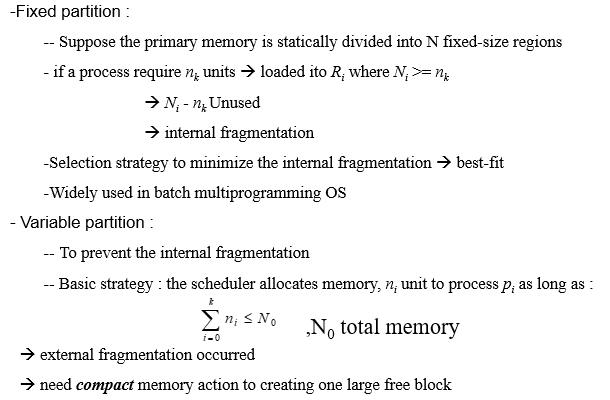 각 프로세스는 자신의 크기만큼 파티션 size를 할당받기 때문에 internal fragmentation이 없다.