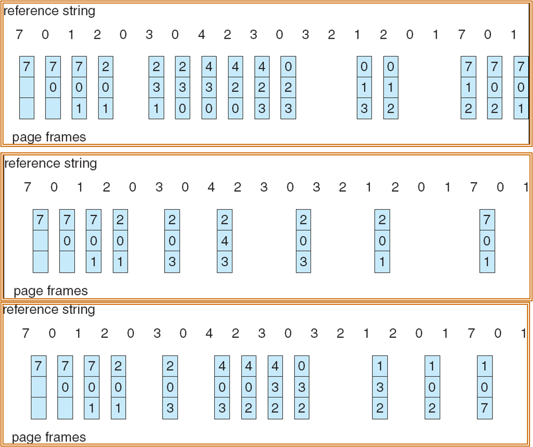 ** Page-replacement algorithm : for 낮은 페이지 오류율. 사용 가능한 프레임 수에 따라 결과가 달라진다.