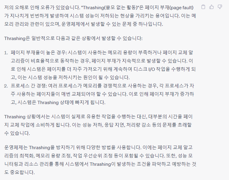 page fault(페이지 부재)가 지나치게 빈번하게 발생하여 시스템 성능이 저하되는 현상.