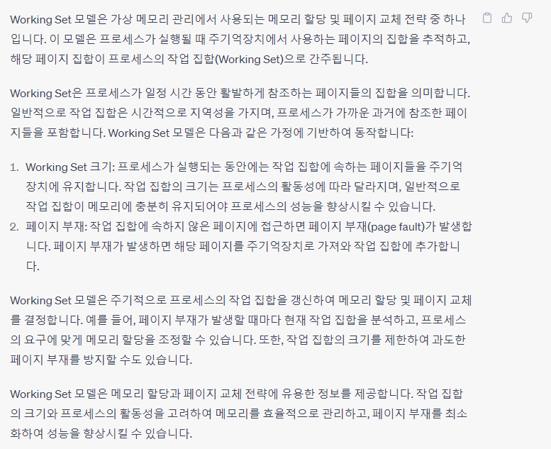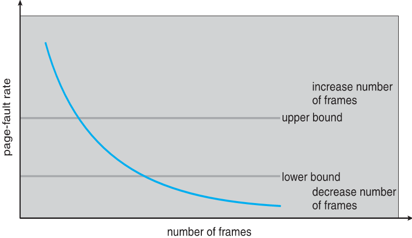 고정 프레임에서 thrashing이 일어난다. (sol) 페이지 프레임을 '동적'으로 할당하자. -> 할당된 page frame에서 반복적으로 (1) page fault가 일어나면 : frame을 더 늘린다. 더 할당한다. (2) page heat가 일어나면 : frame을 줄인다. 덜 할당한다. -> D > m이면 Thrashing, D < m이면 프로세스 중 하나를 일시중단하거나 스왑 아웃한다.