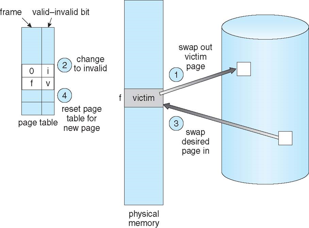 -> 페이지 교체 알고리즘 : victim frame을 선택. 더러워진 디스크가 있다면 거기에 피해자 프레임 씌운다.