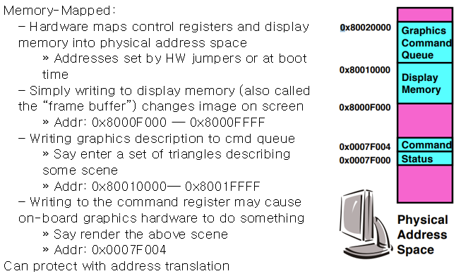 -> Memory mapped I/O : load/store 명령어. 레지스터, 메모리가 물리적 주소 공간에 나타난다.