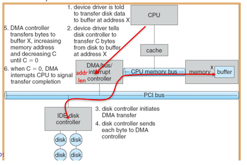 (2) device driver는 disk controller에게 C bytes를 [디스크]에서 [주소 X의 버퍼]로 전송하라고 명령한다.
