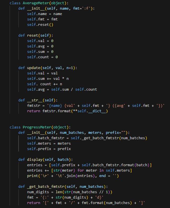 Utils : 학습 진행 상황을 기록하고 출력한다. AverageMeter 클래스는 평균 값을 계산, 출력한다. name, fmt를 인자로 받아 객체를 생성한다. 평균 값을 초기화하는 reset 메서드, 값을 업데이트한 후 그 값을 이용하여 평균 값을 계산하는 update 메서드, 객체를 문자열로 반환하여 출력 형식을 지정하는 __str__ 메서드가 있다.