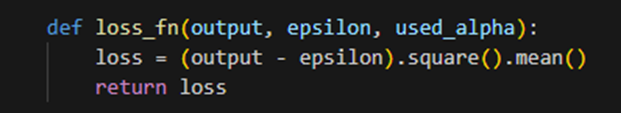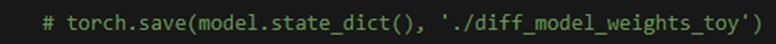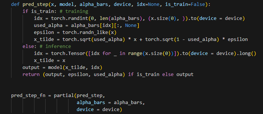 Loss and Prediction : 손실 함수는 입력으로 output(모델의 출력), epsilon, used_alpha를 받아 손실을 반환한다. MSE, 평균 제곱 오차와 유사한 개념을 가진다. pred_step 함수는 주어진 입력에 대해 모델의 예측을 수행한다. is_train이 True인 경우 학습을, False인 경우 추론을 한다. 마지막으로, model을 사용하여 x_tilde와 idx를 입력으로 받아 output을 계산한다. 참고로 pred_step_fn은 alpha_bars, device를 고정된 값으로 사용하여 인자를 재지정할 필요 없이 pred_step 함수를 사용하게 한다. 간편한 호출이 가능하다.