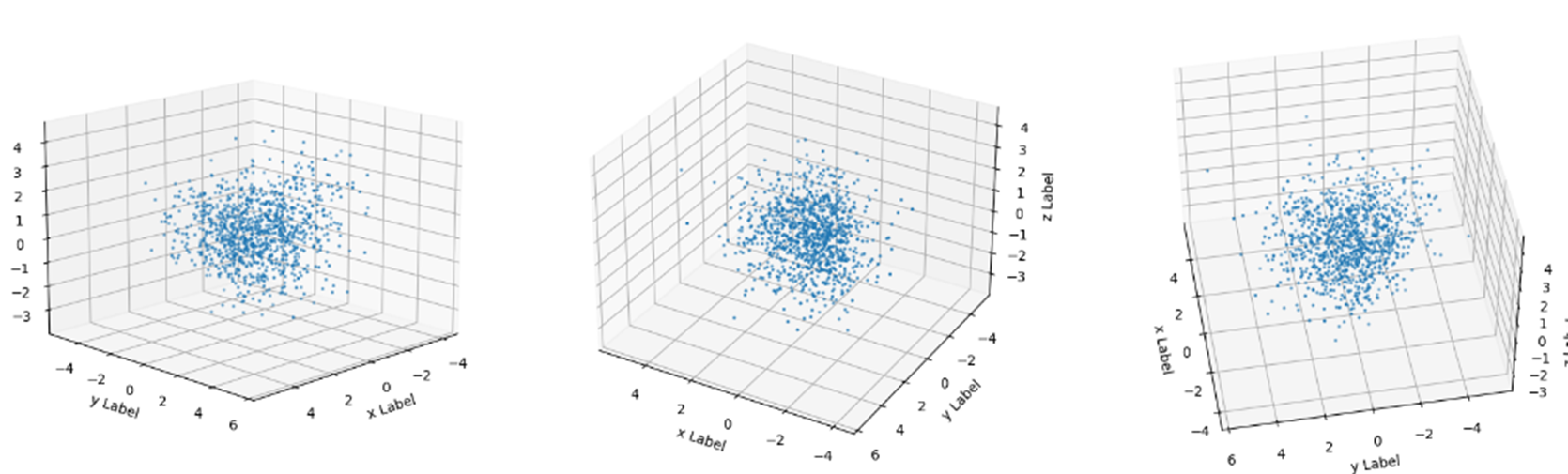 x를 3D 산점도로 시각화한다. 전체 그림의 크기는 (20, 6)이다. 'fig' 객체에 3개의 서브플롯을 추가한다. 131, 132, 133은 각각의 서브플롯을 나타낸다. add_subplot 함수를 사용하여 3D 그래프를 생성한다. scatter 함수를 사용하여 ax0, ax1, ax2에 각각 3D 산점도를 그린다. 각각 x, y. z축의 레이블을 지정한다. 또한 view_init 함수를 사용하여 그래프의 시야를 설정한다. 각각의 서브플롯은 서로 다른 시야로 3D 산점도를 그린다. 즉, 3개의 서브플롯을 추가하였으므로 3개의 산점도가 그려진다. 이들은 형태 동일, 바라보는 각도(시야) 다름.