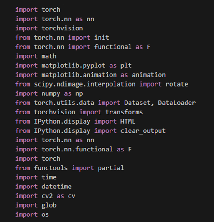 그 외에도 다양한 모듈을 활용한다. math 모듈은 연산을 수행한다. matplotlib.pyplot 모듈은 animation이라는 이름으로 가져오는데, 애니메이션을 생성한다. rotate 함수는 배열의 회전 변환을 수행한다. numpy 모듈을 np라는 이름으로 가져와, 다차원 배열과 수치 계산을 위한 함수를 제공받는다. Dataset와 Dataloader 클래스는 데이터셋을 관리하고 미니배치 학습을 위한 데이터 로딩을 지원한다. transforms는 이미지 전처리를 위한 다양한 변환 함수를 제공한다. HTML은 Jupyter Notebook에서 HTML을 표시하는 기능을 제공한다. clear_output은 Jupyter Notebook에서 출력을 지우는 기능을 제공한다. torch.nn모듈에서 신경망 구축에 사용되는 nn을 가져온다. 'F'라는 이름으로 가져온 모듈은 활성화 함수, 손실 함수 등의 신경망 함수를 제공한다. partial은 다른 함수를 호출할 때 일부 인수를 고정하는 데 사용된다. time 모듈은 시간 관련 작업을 수행한다. datetime 모듈은 날짜와 시간을 제공한다. cv2 모듈은 이미지 및 비디오 처리 작업을 수행한다. glob 모듈은 파일 패턴 매칭을 수행한다. os 모듈은 운영 체제와 상호 작용을 가능케 한다.