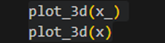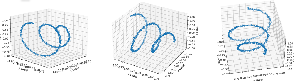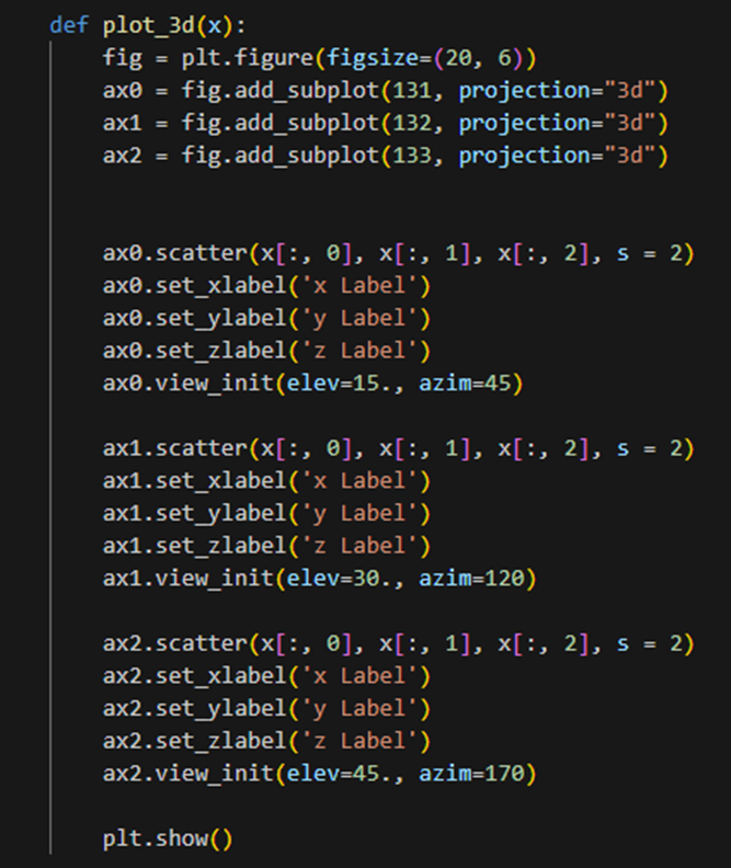 plot_3d 함수는 x_와 x를 3D 산점도로 시각화한다. x_를 입력으로 받아 3개의 서브플롯을 생성하고, 각 서브플롯에 x_의 데이터를 산점도로 표시한다. 각 서브플롯은 서로 다른 시야로 설정되어 데이터를 다른 각도에서 관찰할 수 있다. 아래의 그림처럼 출력이 될 것이다.