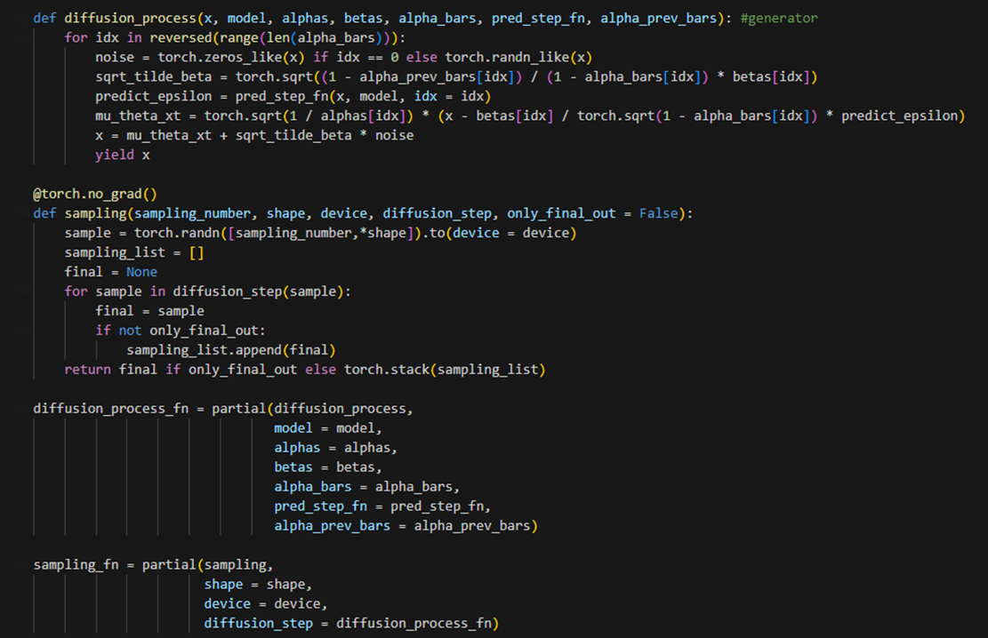 sampling함수는 주어진 입력에 대해 확산 과정을 통해 샘플링을 수행한다. 먼저 크기가 [sampling_number, *shape]인 표준 정규 분포로부터 샘플을 생성한다. 그다음 diffusion_step함수를 통해 샘플에 대한 확산 과정을 수행한다. 각 단계에서의 샘플은 sampling_list에 추가되고, 최종 샘플은 final에 저장된다. only_final_out이 True인 경우 최종 샘플만 반환, False인 경우 샘플 리스트 전체를 반환한다. fn이 붙은 함수들은 인자 재지정 방지 및 함수 간편 호출을 목적으로 만들어졌다.
