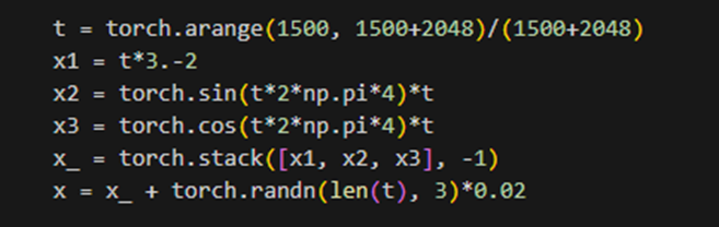 x1, x2, x3를 차원 '-1'을 기준으로 쌓아서 x_를 만든다. x_는 ( lent(t), 3 ) 크기의 텐서로 구성되며, 각 차원은 x1, x2, x3를 나타낸다. x는 x_에 평균이 0이고 표준편차가 0.02인 노이즈를 추가한 결과이다. 주어진 크기의 텐서를 생성한 후 정규 분포에서 무작위 값을 가지도록 샘플링하였다. x는 2048행 3열의 텐서다.