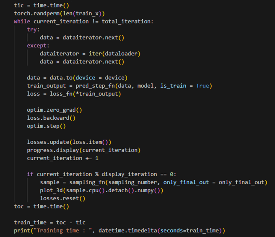 try : data iterator에서 데이터를 가져온다. except : 데이터를 가져오는 과정에서 예외가 발생한 경우, data iterator를 다시 초기화하고 데이터를 가져온다. data를 지정한 디바이스로 이동시키고, pred_step_fn 함수를 호출하여 학습시키고, 예측 결과를 가져온다. 가져온 예측 결과를 loss_fn 함수에 입력하여 손실을 계산한다. 옵티마이저(optim)의 기울기를 초기화한다. 손실에 대한 기울기를 계산한다. 옵티마이저를 사용하여 모델의 매개변수를 업데이트한다. 손실 값을 losses 객체에 업데이트한다. 현재 학습 진행 상황을 출력하고, 총 반복 횟수(40만번)를 채우기 전까지 반복한다. 반복이 끝나면 학습 종료 시간을 기록하여, 학습에 걸린 시간을 계산 및 출력한다.