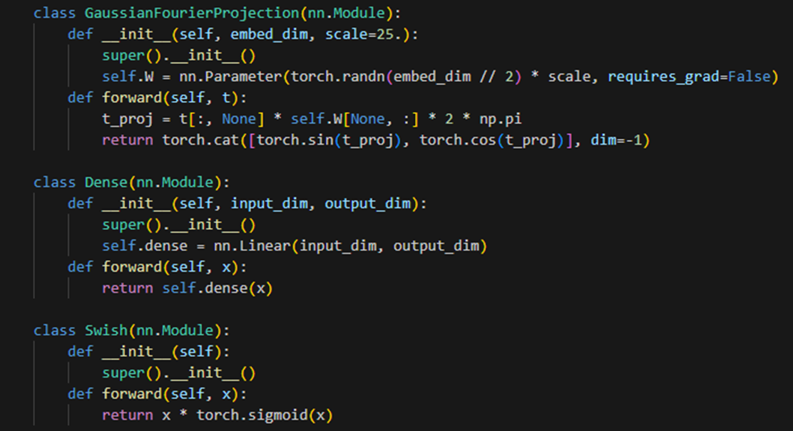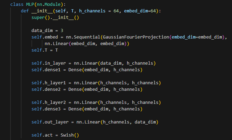 다층 퍼셉트론(MLP) 모델을 정의한다. 첫번째 클래스는 입력된 embed_dim 크기의 가우시안 퓨리에 투영을 수행한다. forward 메서드에서 입력 t를 통해 가우시안 퓨리에 투영을 계산하여 결과를 반환한다. 두번째 클래스는 입력된 input_dim 크기의 피드포워드 신경망 계층을 정의한다. Swish 클래스는 Swish 활성화 함수를 정의한다.