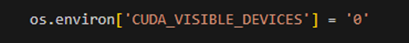 CUDA 디바이스 환경 변수를 설정하는 코드이다. 해당 코드는 환경 변수를 '0'으로 설정하여 첫번째 GPU 디바이스를 사용하도록 지정한다. CUDA 사용 프로그램에서 첫 번째 GPU 디바이스에만 액세스하게 된다.
