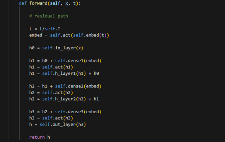 MLP 클래스는 MLP 모델을 정의하는 모듈이다. T, h_channels, embed_dim 등의 인자를 받는다. forward 메서드에서 입력 x, t를 통해 MLP의 출력을 계산한다. MLP는 잔차 경로를 사용하여 입력 데이터와 가우시안 퓨리에 투영된 임베딩을 합산하고, 여러 개의 fully conneted layer를 거친 후 최종 출력을 반환한다.