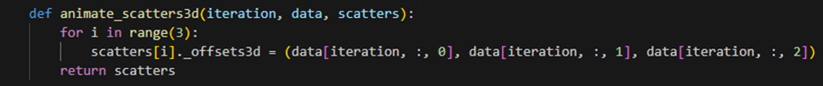 Result : 3D 산점도 애니메이션을 생성하는 함수인 animate_scatters3d를 정의하는 부분이다. data는 3D 산점도의 데이터를 나타내는 배열로, [반복 횟수, 점 개수, 3]의 크기를 가진다. scatters는 3D 산점도의 점들을 나타내는 객체이다. data 배열을 사용하여 scatters의 점들 위치를 업데이트한다. 반복문을 통해 scatters의 각 점들의 위치를 현재 iteration에 해당하는 데이터로 업데이트한다. 마지막으로, 업데이트된 scatters 객체를 반환한다.