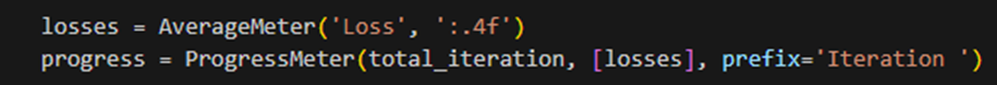 AverageMeter 객체 losses, ProgressMeter 객체의 progress를 생성한다. losses는 손실 값을 기록하고 출력하기 위한 도구로, 'loss'라는 객체를 생성한다. progress는 학습 진행 상황을 출력하기 위한 도구로 total_iteration 값과 [losses] 리스트를 인자로 전달하여 객체를 생성한다. 학습과정에서 손실 값을 기록하고, 학습 진행 상황을 출력하는 데 사용된다.
