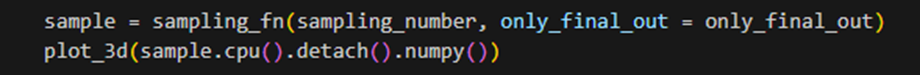 생성된 샘플을 이용하여 3D 산점도 애니메이션을 생성하고, GIF 파일로 저장하는 부분이다. 생성할 샘플의 개수를 2048로 설정한다. 주어진 개수의 샘플을 생성하고, 모든 샘플을 반환하도록 한다. 각각 시간을 기록하여 샘플링에 걸린 시간을 계산, 출력한다. show_sample이란 생성된 샘플 중에서 일부를 선택한 것으로, 이렇게 선택된 샘플을 정렬 순서로 재배열한다. 색상 맵 cmap을 생성할 떄도, show_sample과 동일한 개수의 색상을 생성한다. 3개의 서브플롯을 가진 fig, axs를 생성하고 각 서브플롯의 x, y, z축에 레이블을 설정한다. ax.view_init로 시야각을 설정한 다음 FuncAnimation 함수를 사용하여 3D 산점도 애니메이션을 생성한다. GIF 파일을 생성하기 위한 PiIlowWriter 객체를 생성한 후, 애니메이션을 'ddpm_toy.gif'라는 GIF 파일로 저장한다.