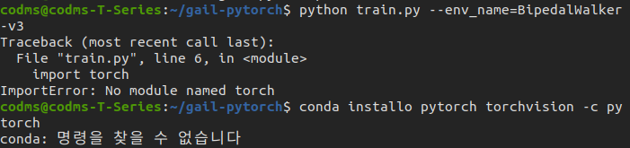 첫 번째 오류는 ImportError : No module named torch.