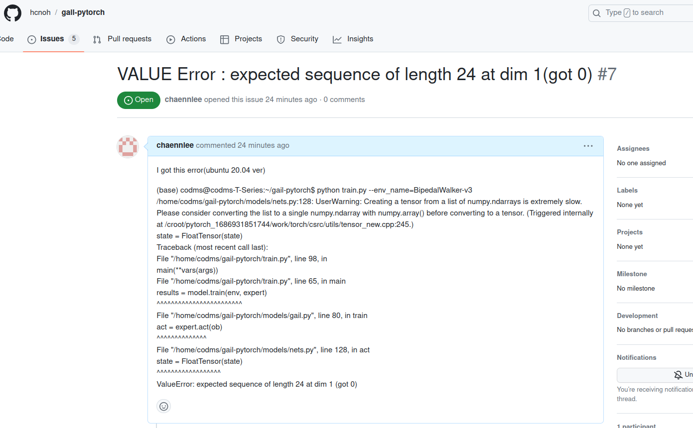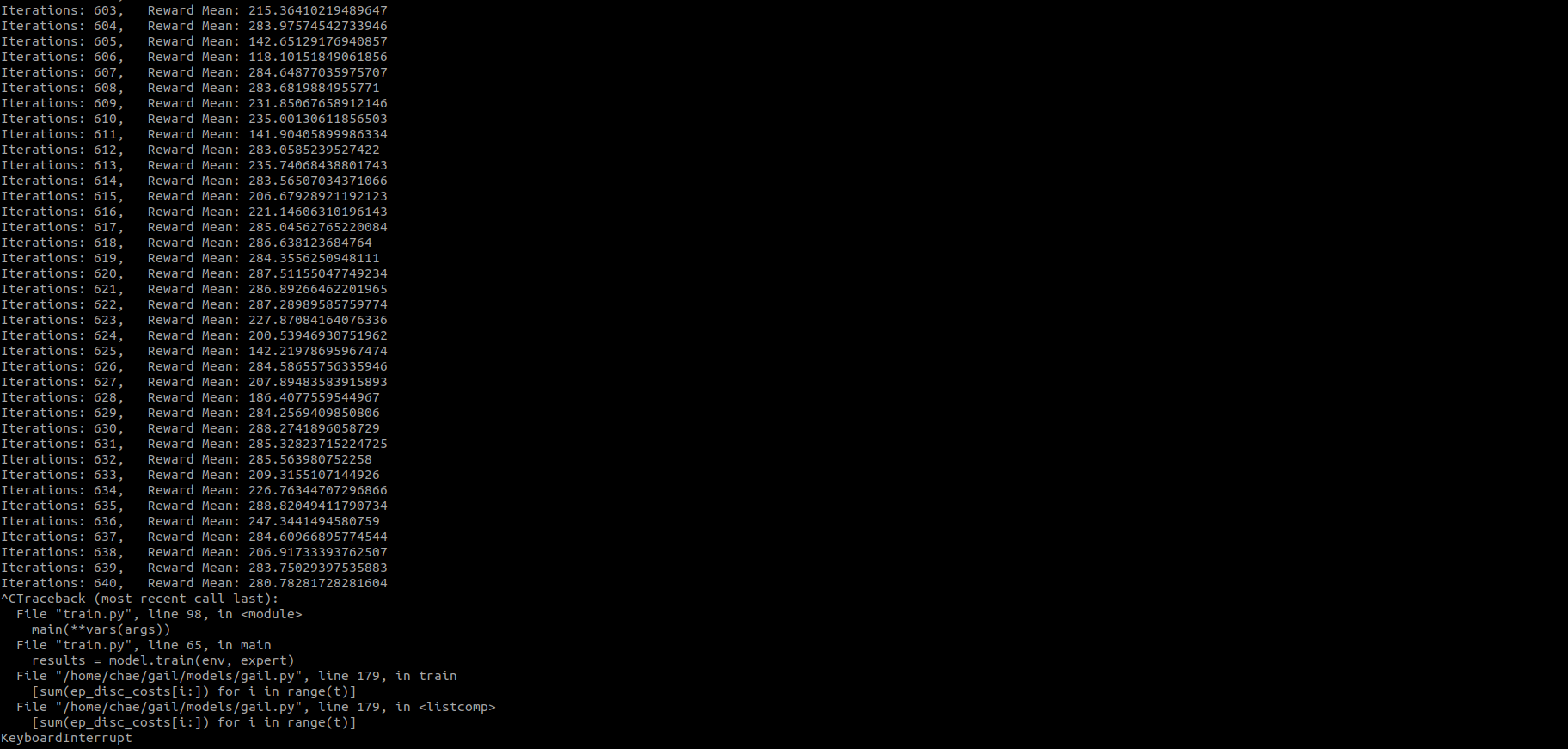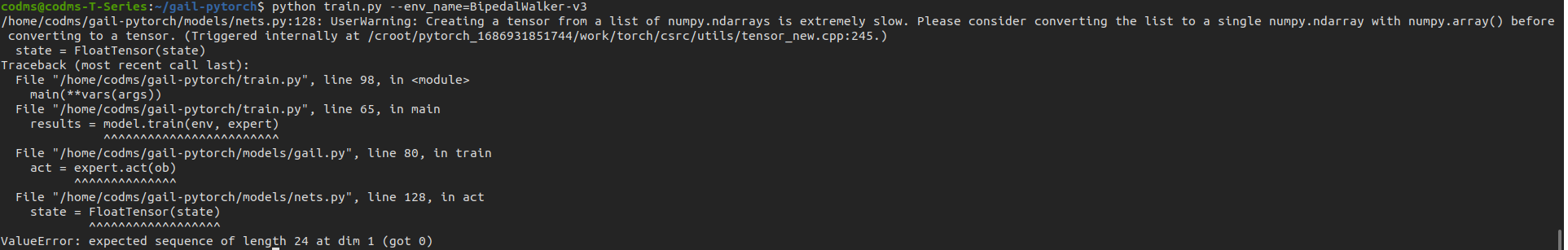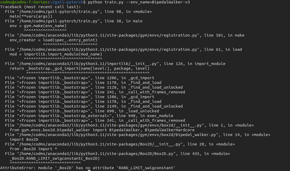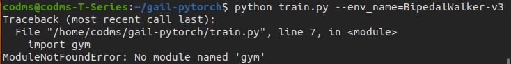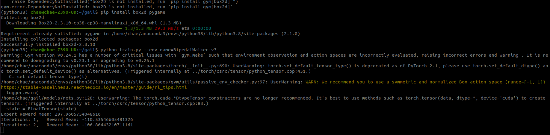 reset ubuntu. -> install ros, and all about ros(package). -> install conda, and pytorch. -> conda activate python(ver3.8). -> git clone gail. -> pip install box2d pygame. -> python train.py --env_name=BipedalWalker-v3