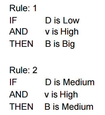 (4) Set the IF-THEN rules. This is how combinations of the input determine the output. For example, IF D is low AND v is high, THEN B is big. Similarly, the other rules are defined. This is where the non-quantitative human reasoning comes in. A simple two-rule system could be like that.