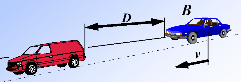 (1) Define the inputs and outputs. There are two inputs : D, the distance between the cars, and v, the velocity of the following car. There is one output: B, the amount of braking to apply to the followin car(force). The inputs and outputs are shown in the figure below.