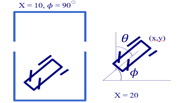 (1) The simulated truck and loading zone are shown in Fig. 12.4. The truck position is determined by three state variables 𝜙, x and y, where 𝜙 is the angle of the truck with respect to the horizontal line. Control to the truck is the steeling angle 𝜃.