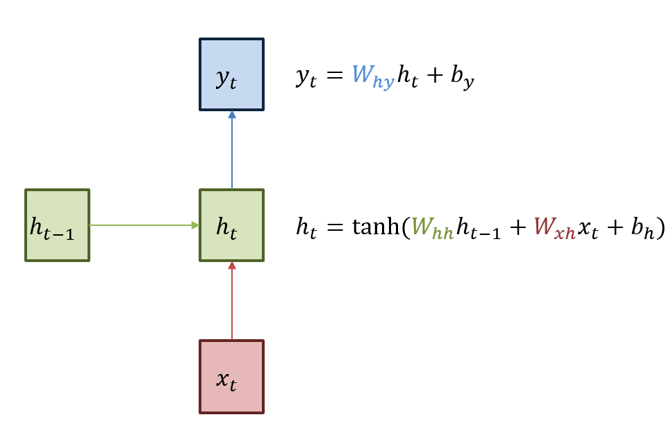 Recurrent Neural Network의 약자로, 내부에 순환 구조가 들어있다. 순환 구조에서 '과거 학습'을 가중치를 통해 '현재 학습'에 반영한다. 순차적 데이터 학습의 한계를 해결한 알고리즘이다. 순환 계층(Recurrent Layer)에선 이전 단계의 출력을 현재 단계의 입력과 함께 사용하여 시퀀스의 패턴을 학습한다. 은닉 상태(Hidden Layer)에선, RNN은 이전 단계의 은닉 상태를 유지하면서 현재 입력을 처리하므로, 시퀀스 내에서의 정보를 유지하고 전달하는 데 용이하다. 현재 학습과 과거 학습의 연결이 가능하고, 시간에 종속된다는 특징을 가진다. 위의 그림에서 녹색 박스는 Hidden Layer, 빨간 박스는 Input x, 파란 박스는 Output y다.