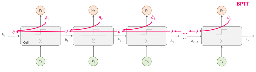 RNN은 기존 신경망의 역전파와는 달리, time step별로 네트워크를 펼친 후 역전파 알고리즘을 사용한다. 쉽게 말해 오차를 역전파하여 네트워크를 훈련하는 과정이다. 각 시간 스텝마다 RNN은 입력을 받고 출력을 생성하는데, 이러한 스텝 간에는 순환적인 연결이 존재한다. 따라서 시간 스텝 t에서의 오차를 계산하고, 이를 이전 시간 스텝으로 역전파하여 가중치를 업데이트한다.