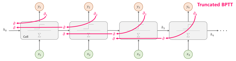 RNN에서 학습 과정을 좀 더 안정화하기 위해 사용된다. 시간 스텝을 일부 제한하고, 제한된 시간 범위 내에서만 역전파를 수행한다. 예를 들어 시퀀스가 1000개의 시간 스텝으로 구성되어 있다면, Truncated BPTT를 적용할 시 각 학습 단게에서 100개의 연속적인 시간 스텝만 고려할 수 있다. 이렇게 하면 계산량과 메모리 사용량을 크게 줄일 수 있다.