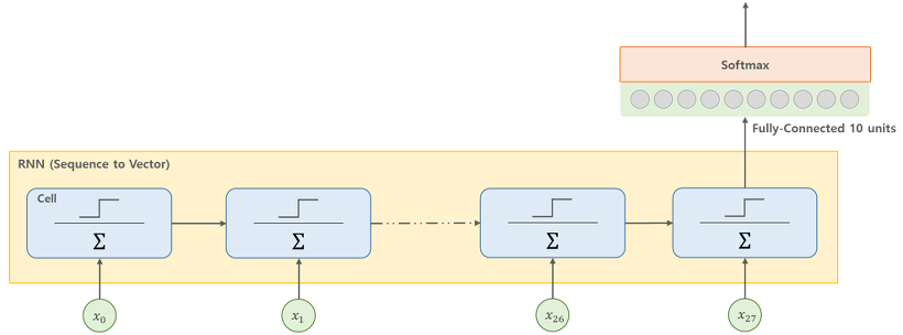 두번째로, MNIST 데이터셋을 분류하는 RNN 모델을 만들어준다. 해당 모델은 28개의 타임 스텝(28 pixels)의 시퀀스를 입력받아 하나의 벡터를 출력하는 Sequence-to-Vector 모델이다.