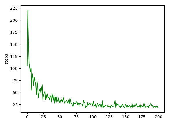 그래프를 보면 처음 'T'로 도달할 때는 105번이 걸린 것이고, 20번째로 'T'에 도달할 때는 55번이 걸렸으며, 90번째로 'T'에 도달할 때는 19번이 걸렸다. 이와 같이 학습을 통해 점차 시도 횟수를 줄여나가는 것을 알 수 있으며 성능이 높아짐을 알 수 있다.