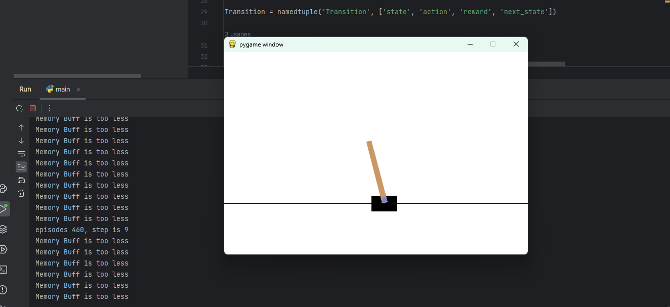 파이참의 가상 환경에서 실행한다. 새로운 프로젝트를 생성하여 'pip install numpy', 'pip install padas', 'pip install matplotlib'을 터미널 창에 입력한 후 설치를 완료한다. 추가로 'pip install gym', 'pip install torch', 'pip install tensorboardx'를 통해 모듈들을 설치한다. Run시키면 아래 코드가 수행된다.