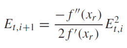 이 방법의 [1] 장점은 (i+1) 반복의 오차는 i의 오차 제곱에 대략 비례한다는 것이다. 이것을 quadratic convergence(2차 수렴)이라고 한다.