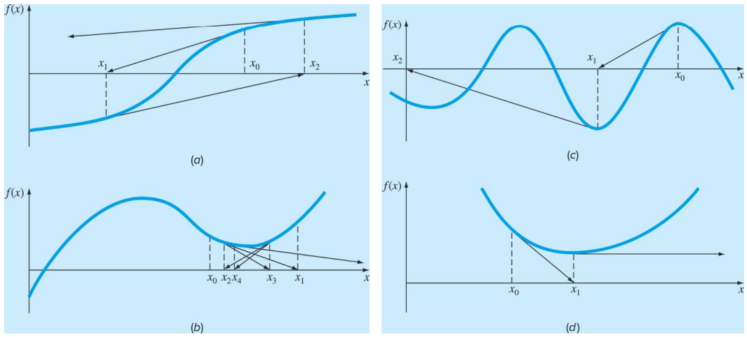 [2] 단점은, 근을 찾는 과정이 느리거나, 발산할 수 있다는 것이다. 이를 해결하기 위해, 최대한 root과 가깝게 초기값을 지정해야 한다. 아래는 근 찾기를 실패한 그림들이다.