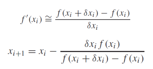 이러한 근사치를 (2)에 대입하면, 아래 공식들을 얻을 수 있다. 참고로, 이 방법은 도함수를 분석할 필요는 없지만, 초기 x 추정치가 2개 필요하다는 단점을 가진다.