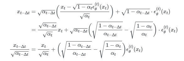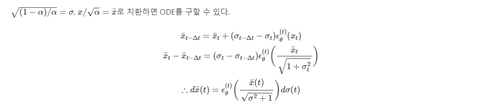[3] Relevance to Neural ODEs : DDIM 샘플링 식을 다음과 같이 다시 쓸 수 있으며, 상미분방정식 ODE를 풀기 위한 Euler intergration과 비슷해진다.