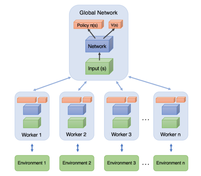 Asynchronous Adbantage Actor-critic은 한 개가 아닌, 여러 개의 agent를 실행하며 주기적으로, 비동기적으로 공유 네트워크를 업데이트한다. 다른 agent의 실행과는 독립적으로, 자기가 공유 네트웤르르 업데이트하고 싶을 때 업데이트하기 때문에 비동기적이라 한다.