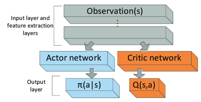 Acotr 네트워크, Critic 네트워크. 2개의 네트워크를 이용한다. Actor는 상태가 주어졌을 때 행동을 결정하고, Critic은 상태의 가치를 평가한다. 행동과 가치를 분리한다는 점에서 Dueling DQN과 유사하지만, Actor-critic은 마지막에 값을 합치지 않는다. 물론 Actor-critic은 replay buffer를 사용하지 않는다.