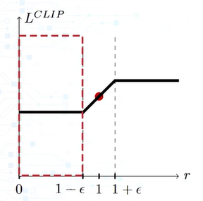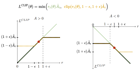 advantage가 양수일 때는 1+ ε, 음수일 때는 1- ε에 의해서만 clipping이 발생한다. 다시 말하자면 한번에 너무 많은 L CLIP이 증가하는 방향으로 policy가 업데이트되는 것을 피하고자 한다.