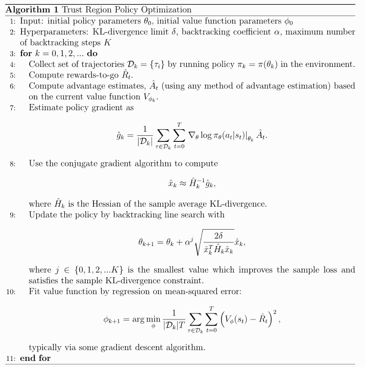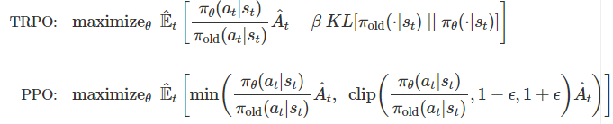 주어진 데이터를 가지고 현재 policy를 최대한 큰 step만큼 빠르게 향상시키면서도, 너무 큰 step으로 업데이트하는 것을 억제하고자 한다. 아래는 PPO과 TRPO의 최적화식이다. TRPO에서는 전자 항을 최대화하면서 후자 항을 최소화하는 것을 목표로 한다. [1] 목적식을 통해 policy의 improvement step을 최대화한다. [2] 이와 동시에 KL divergence를 통해 기존 정책과 새 정책 간의 거리를 제한한다.