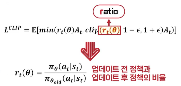 -> clip 연산은 업데이트 전 정책과 업데이트 후 정책의 비율을 0.8에서 1.2 사이의 값, 즉 1 근처의 값으로 제한한다. 이는 업데이트 전 정책, 후 정책 간의 차이가 크지 않음을 의미하며 PPO는 clip 연산을 통해 정책이 과도하게 업데이트되는 것을 방지한다.