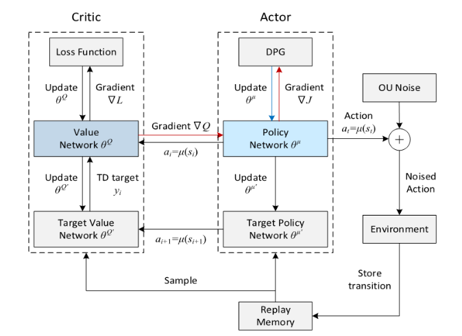 1. 주어진 상태 st에서 정책 네트워크, OU 과정을 통해 행동 at를 획득한다.