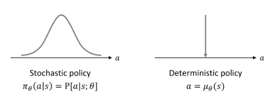 stochastic policy는 행동에 대한 확률 분포를 의미한다. deterministic policy는 하나의 행동에 대한 확률만을 가진다. deterministic policy는 행동을 파라미터화할 수 있으며, 연속적인 행동을 나타낼 수 있다는 장점을 가진다.