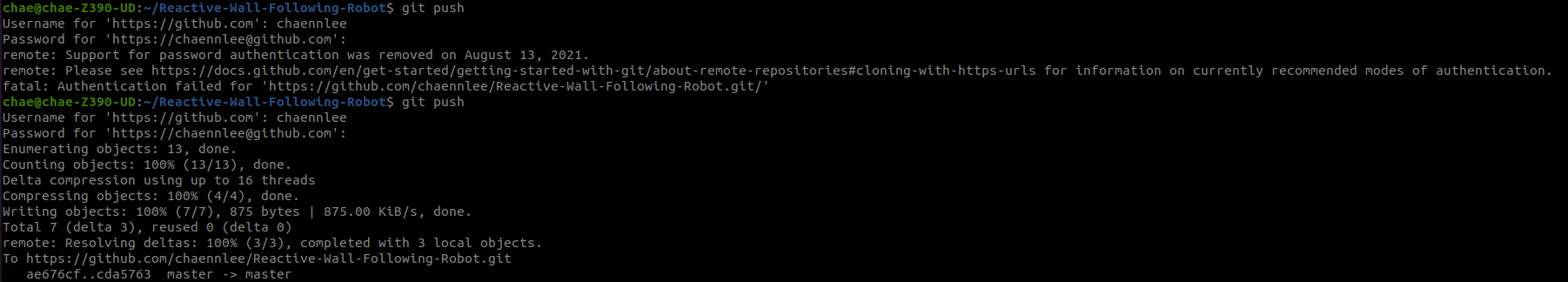 (2) git push할 때 Username for 'https://github.com'과 Password for 'https://chaennlee@github.com'이 뜰 것이다. 닉네임과 비밀번호를 입력하면 fail이 뜬다. 2021년부터 깃허브에서 아이디 비번 방식의 접근을 없앴다. 해결책으로는 Access Token을 발행시킨 후, 그것을 password 칸에 입력해야 한다.