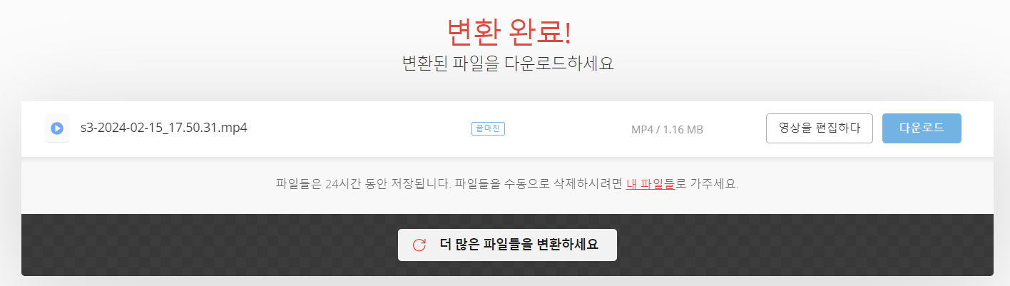 파일 변환기에서 파일 선택을 누른 후, 동영상을 선택한다. 아래 버튼의 비디오 -> MP4를 눌러 확장자를 MP4로 변환한다.