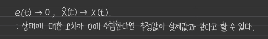 (2) 이 변수들을 사용한 observer의 기본수식은 다음와 같다. 원래의 상태 방정식에선 A를 system matrix로써 사용했다. 새로 얻은 수식에서는 A0( = A - LC)를 새로운 system matrix로 치환하여 값을 구하면 된다. 참고로 C 행렬은 transition matrix로, 상태 추정식에 존재하는 차원들을 센서 데이터의 차원과 맞추어 준다. 높은 차원을 낮은 차원으로 매핑하는 것이 더 쉬우므로 모델링 식의 차원을 센서 데이터의 차원으로 맞추는 것이다.