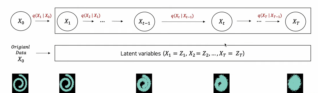 Diffusion process는 conditional Gaussian의 joint distribution으로, X0를 기반으로 X1부터 XT까지의 Latent variables을 생성하는 과정이다.